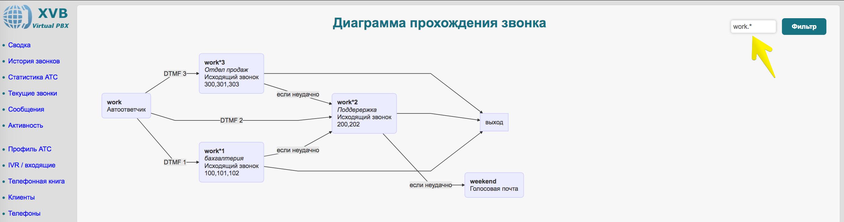 В диаграмме прохождения звонка можно использовать фильтры чтобы показать часть схемы. Можно использовать регулярные выражения.
